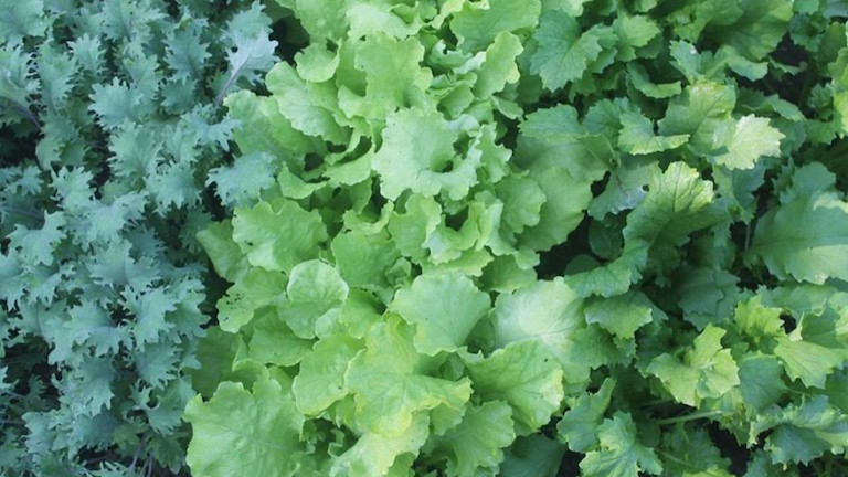 Successions of cold-hardy leafy greens — such as the Red Russian kale, Tokyo Bekana Chinese cabbage and Mizspoona seen here — can be sown every two to three weeks from early spring through late summer. Holli Cederholm photo