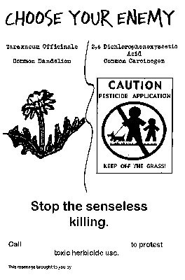 Copy of a poster that Willow Wetherall and other students put around the U. of Maine campus after 2,4-D was applied to lawns. The number to call and sponsor of the message have been left blank in this poster so that other organizations may copy and use the it for their own protests.