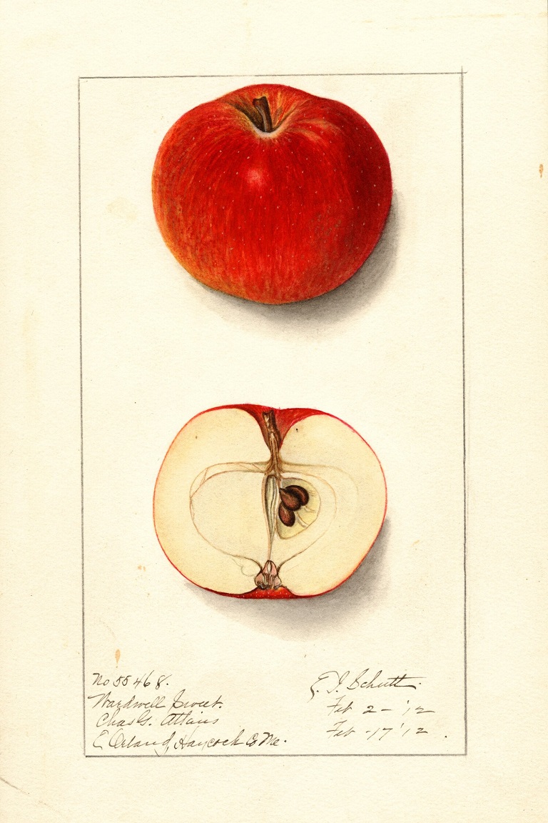 Large, lumpy, yellow ground with red blush, russeted cavity, numerous dots.