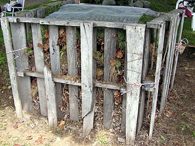 | Master Gardeners provided this display of compost containers and a thermometer at Brae Maple Farm one summer. They include a rotating drum (Compos-Tumbler), a bin made from recycled plastic and one made from pallets. A series of three wooden bins in a row (made from pallets or constructed of wood) will enable a gardener to turn piles more easily. |