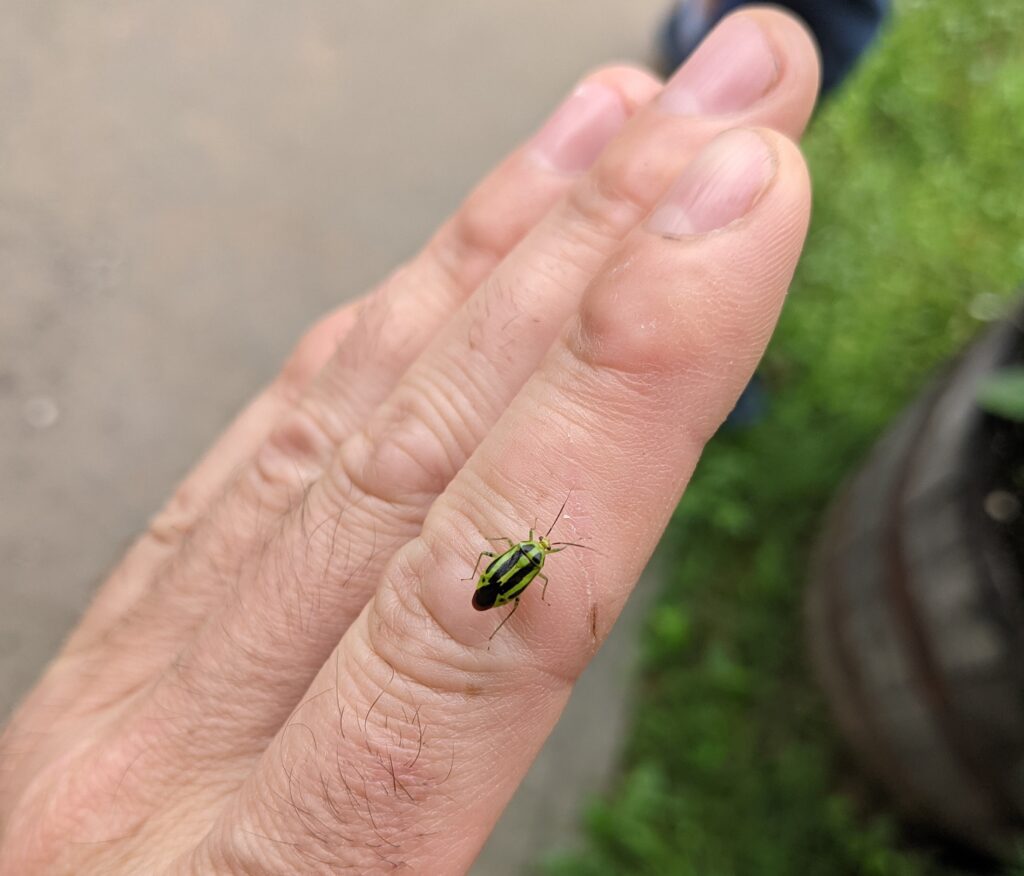 Four-lined plant bugs and their management are similar to tarnished plant bugs, though their adult form stands out and is more easily spotted, as they are yellow with four black stripes — somewhat similar in appearance to striped cucumber beetles. Four-lined plant bugs also feed on a very wide variety of plant species, and particularly like feeding on leaves from the mint family. Their feeding damage causes round sunken dead spots on a leaf, which may eventually become transparent, or even fall out of the leaf, leaving a round hole. Because they create many of these spots in the same area as they feed, it can often look alarmingly like a foliar disease.