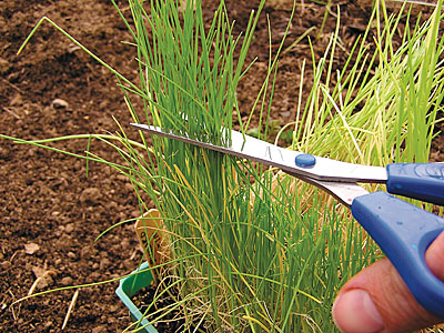 | Trim the tops of onion and leek seedlings to make the bases thicker. Use the trimmings in soups or salads. English photo. |