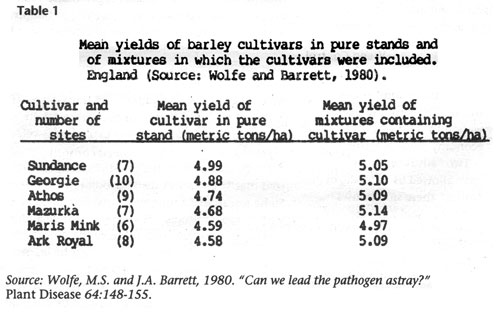 Mixtures of barley cultivars might produce higher yields than single cultivars, Liebman continued, because different cultivars will have different tolerances to various strains of disease. “A mixture of varieties is harder for any particular strain of disease to hit,” he said, “so there will be less buildup of disease than in solid stands of a single variety.” This should lead to higher yields. He cited data from England (Table 1) showing higher yields in stands containing mixtures of cultivars versus pure cultivars.