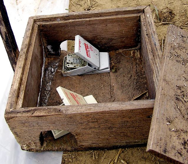 | Voles, which thrive in the protected structure, are trapped in a wooden box holding two traps but no bait. Photo by Jean English, 2007. |