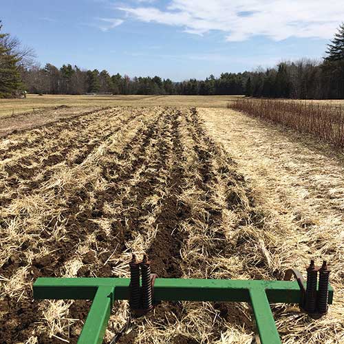 Primary tillage tools are a 6-foot rototiller and a chisel plow. Hopkins says, “The chisel plow has been critical to breaking up the compaction caused by years of haying.” Each field gets chisel plowed and rototilled each year. She acknowledges that rototilling is a controversial tillage method, but she believes that between the combination of her lighter soil and a high ground speed, she can make a decent seedbed without compromising the soil structure.