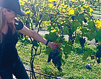 | Heather Selin shows ‘Frontenac Gris’ grapes – one of more than 1,200 plants growing at Earth Dharma Farm. Stowell Watters photo |