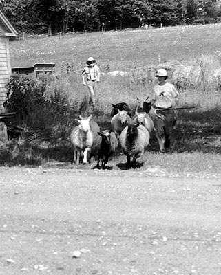 | Paula urges sheep to their new pasture – trailed by Pippin, the Australian Sheep Dog, who missed the photo op. Lamb photo. |