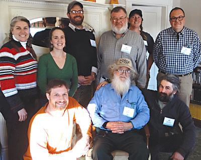 | The MFFM board. Front L-R: Mike Gold (Maine Farmland Trust), Tom Roberts (Snakeroot Organic Farm), Mark Guzzi (Peacemeal Farm); Back L-R: Heather Donahue (Balfour Farm), Sherie Blumenthal (St. Mary’s Nutrition Center), Clayton Carter (Fail Better Farm), Jack McAdam (McDougal Orchards), Hanne Tierney (Cornerstone Farm) and Rob Lawless (Took a Leap Farm). Photo courtesy of MFFM |